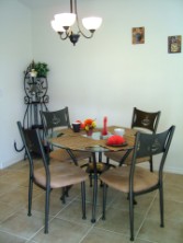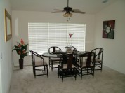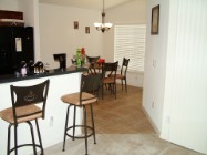 Großer Esstisch mit 6 Stühlen und beleuchteter Vitrine. Frühstücksecke mit Blick auf den großen Pool. Die geräumige Küche mit Bar lässt keine Wünsche