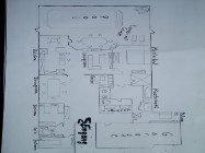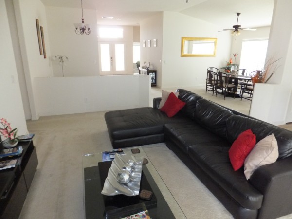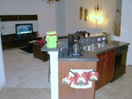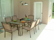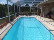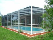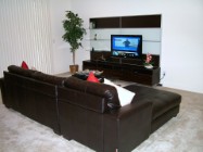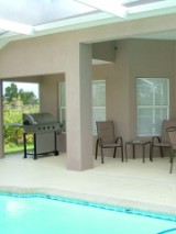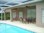 offen. Sie ist komplett ausgestattet. Das helle Wohnzimmer öffnet sich mit Glasschiebetüren zur Poolarea. Vor der mit einem 40'' TV bestückten Wohnwand steht eine dunkle Ledercouch. Der beheizbare Pool mit blauen Delfin-Fliesen ist 4x9 m groß und lädt zum Baden ein. Das große Sonnendeck ist mit Liegen, einem Esstisch mit 8 Stühlen und einem großen Gasgrill bestückt. Überdacht wird die Poollandschaft mit einem weißen Screen (wie eine Aluminium-Wintergarten-Konstruktion, mit Netz statt Glas).